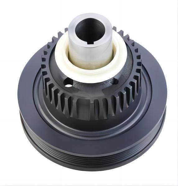 曲軸減震皮帶輪,是發(fā)動機(jī)前端附件系統(tǒng)的重要零件之一,分為橡膠減震皮帶輪、硅油扭轉(zhuǎn)減震皮帶輪及橡膠硅油復(fù)合型扭轉(zhuǎn)減震皮帶輪,基本結(jié)構(gòu)一般由輪轂、外圈、橡膠組成,大多安裝于曲軸的前端,傳遞曲軸輸出的扭矩以驅(qū)動輪系附件。